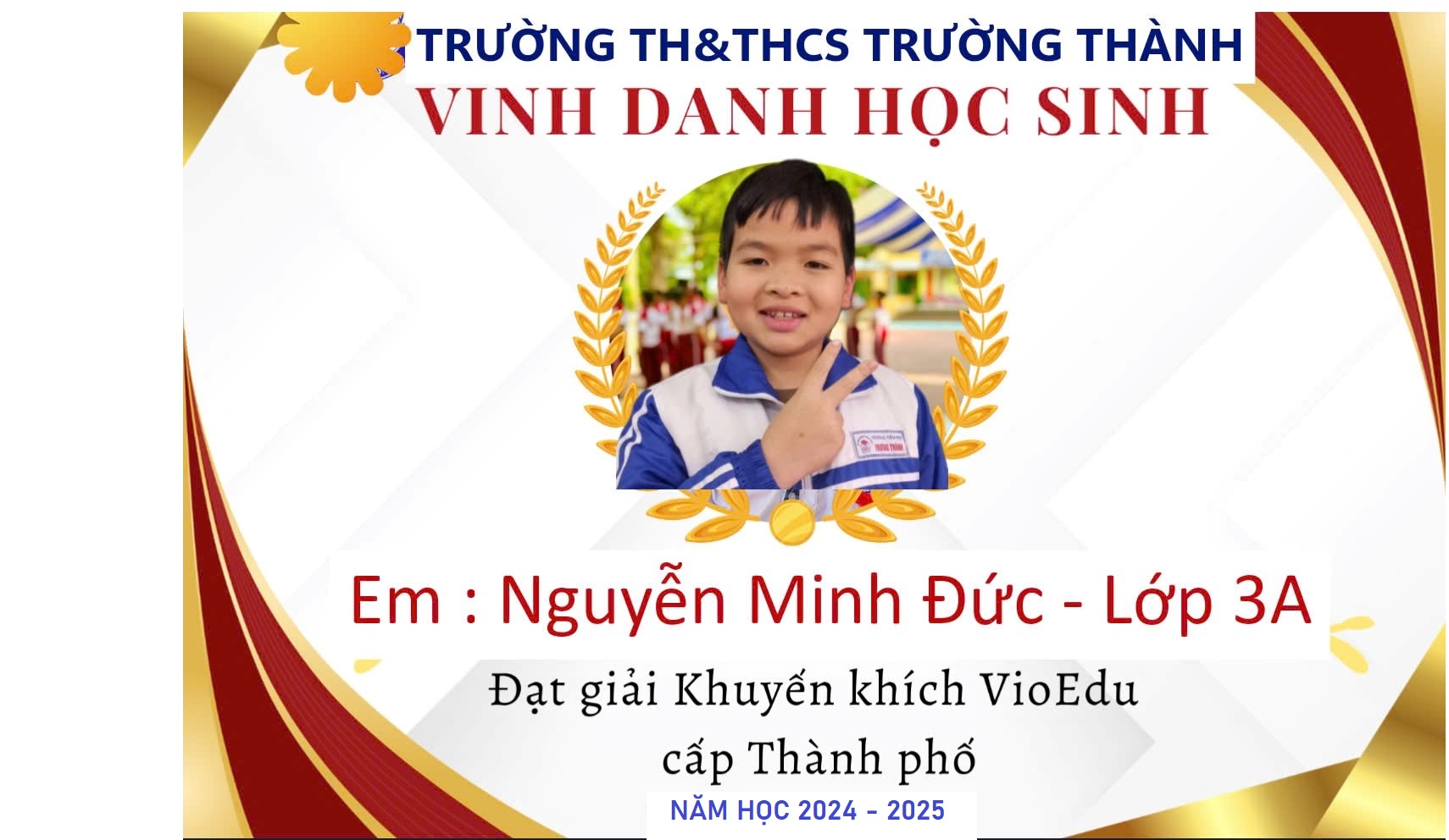 Đấu trường VioEdu Thành phố Hải Phòng năm học 2024-2025 đã chính thức khép lại. Sau thời gian học tập và thi đấu trên sân chơi, em Nguyễn Minh Đức lớp 3A đã đạt giải Vàng đấu trường Tổng hợp cấp huyện và đạt giải Khuyến khích đấu trường Tổng hợp VioEdu cấp thành phố. Xin chúc mừng em!